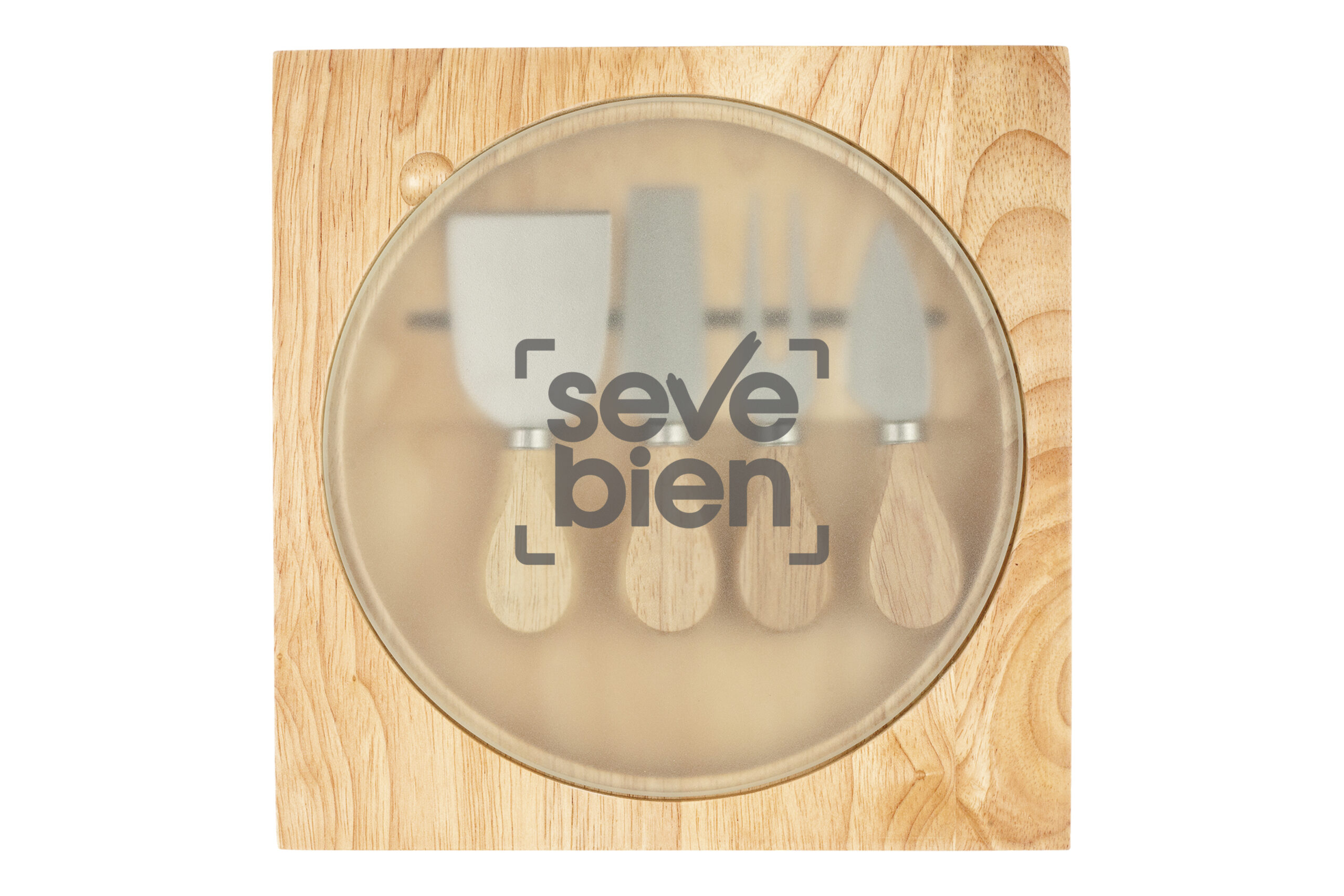 23 x 23 x 2,5 cm. Madera. Tabla para quesos. En la parte interna contiene imán que sostiene 4 utensilios de acero inoxidable y mango de madera. Tabla circular de vidrio templado Ø 20 cm. Presentación en caja de regalo.